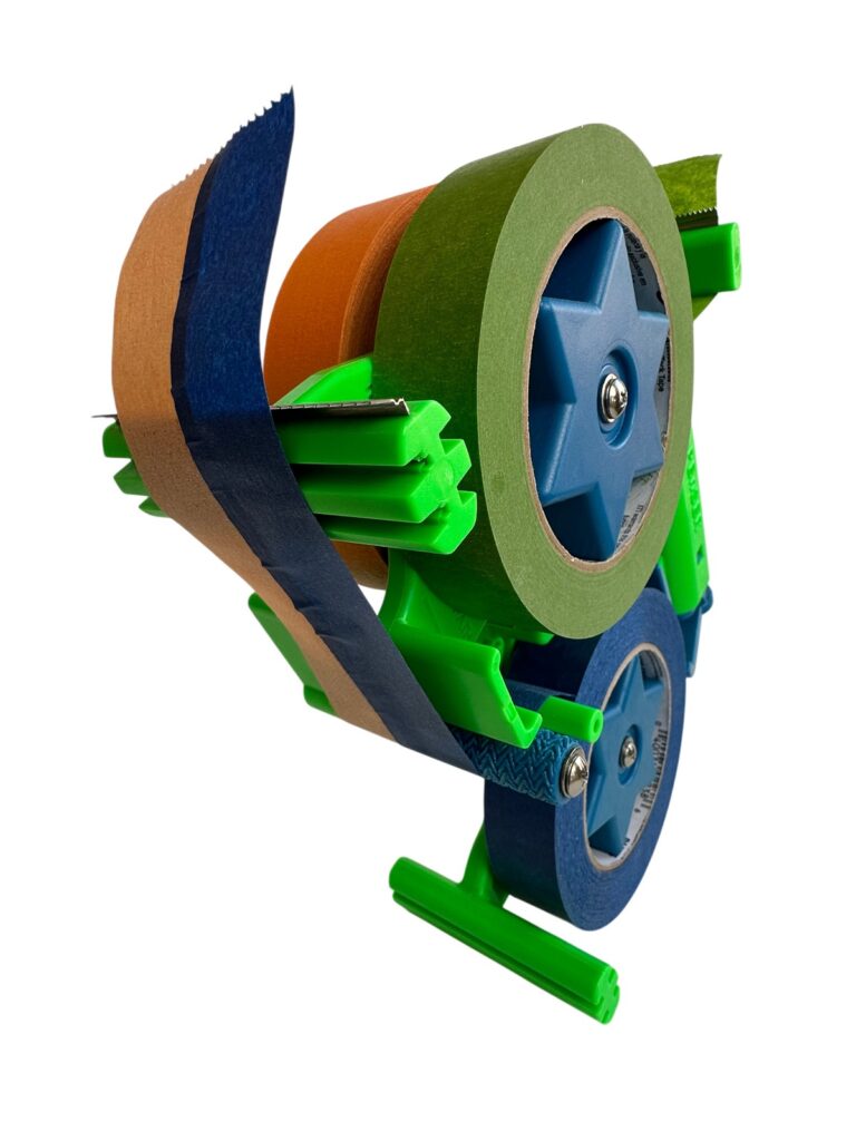 TAPEnSER is the “Tape Answer” – A very well-designed double/triple masking tape dispenser for producing and dispensing partially overlapped, reverse-conjoined tapes.